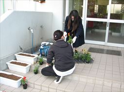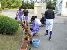 PTA、野球部、有志生徒で、玄関に飾るプランターの整備をしました。